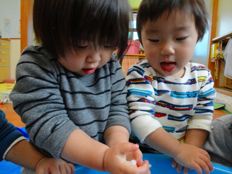 お部屋の中でタライに入った雪を持ち込んで遊んでいる0歳児すやすや組。