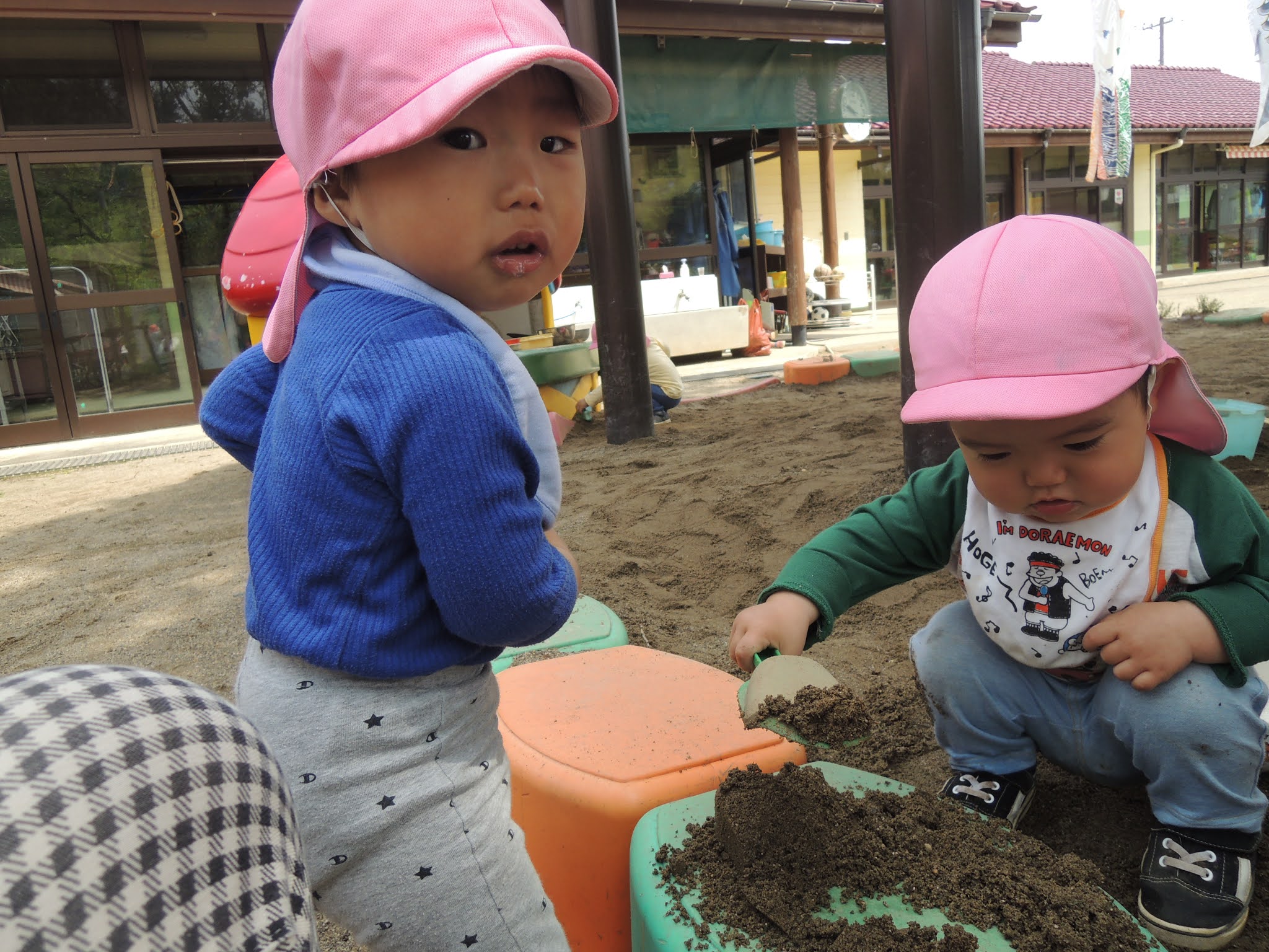 にこにこ組のお友だちが砂をシャベルでザザザ…とすくって落とすのを見て 嬉しさ・楽しさを共感した瞬間です! 二人ともケラケラと大笑いして、しばらく繰り返していました。 |